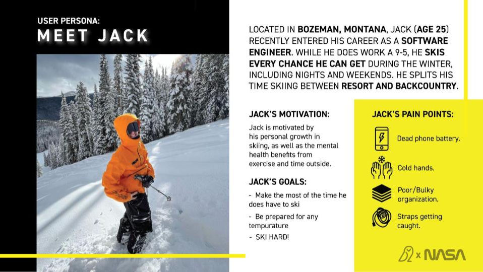 For a "Design Thinking" class, my teammates Sydney Lenssen, Taiden Gregson and I were tasked with designing a product using technology form the NASA patent portfolio, which would align with the WNDR alpine product line.